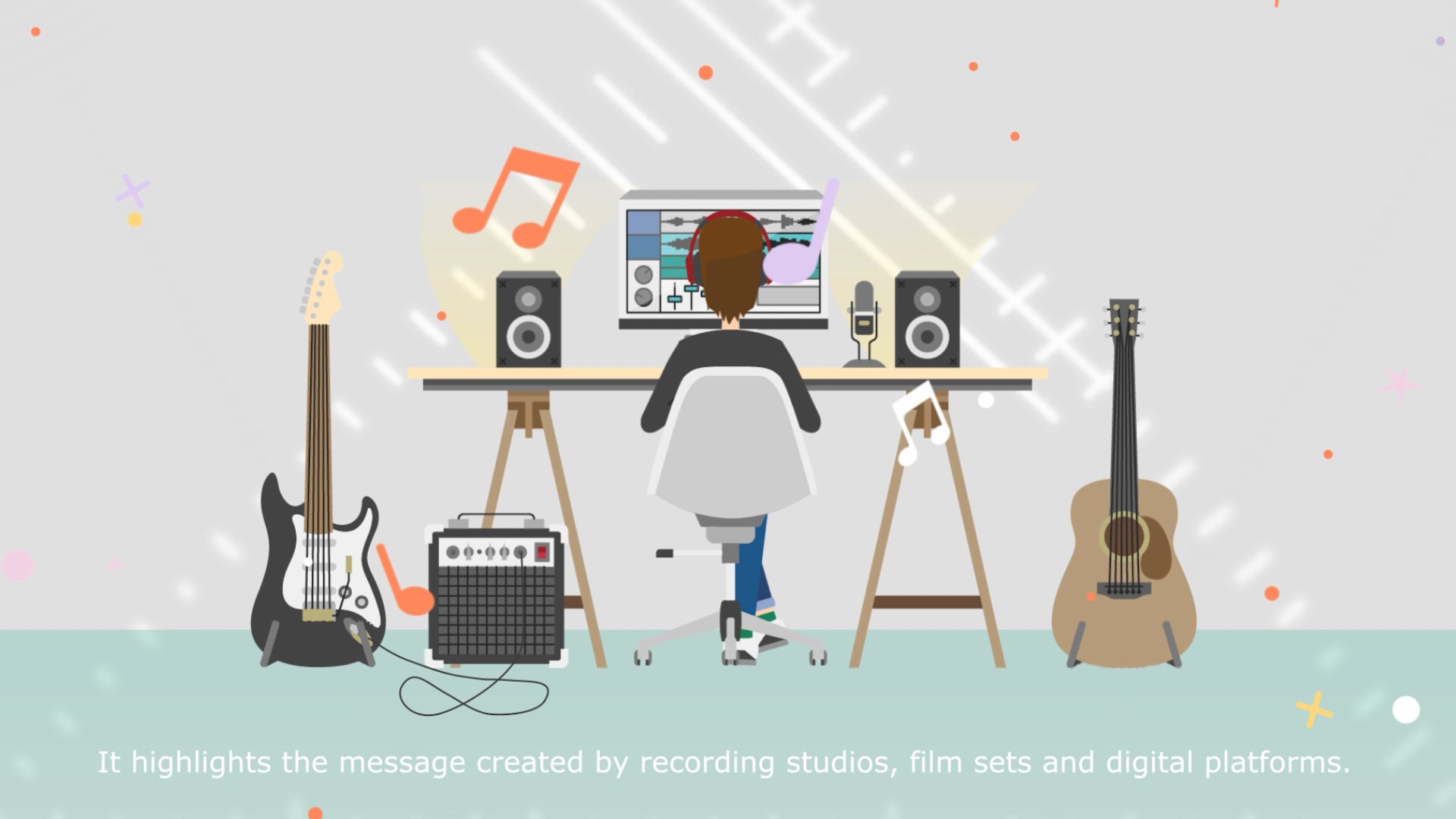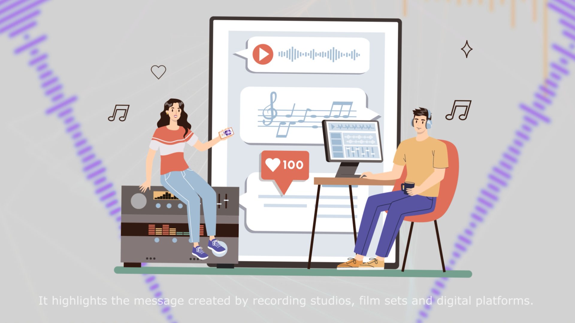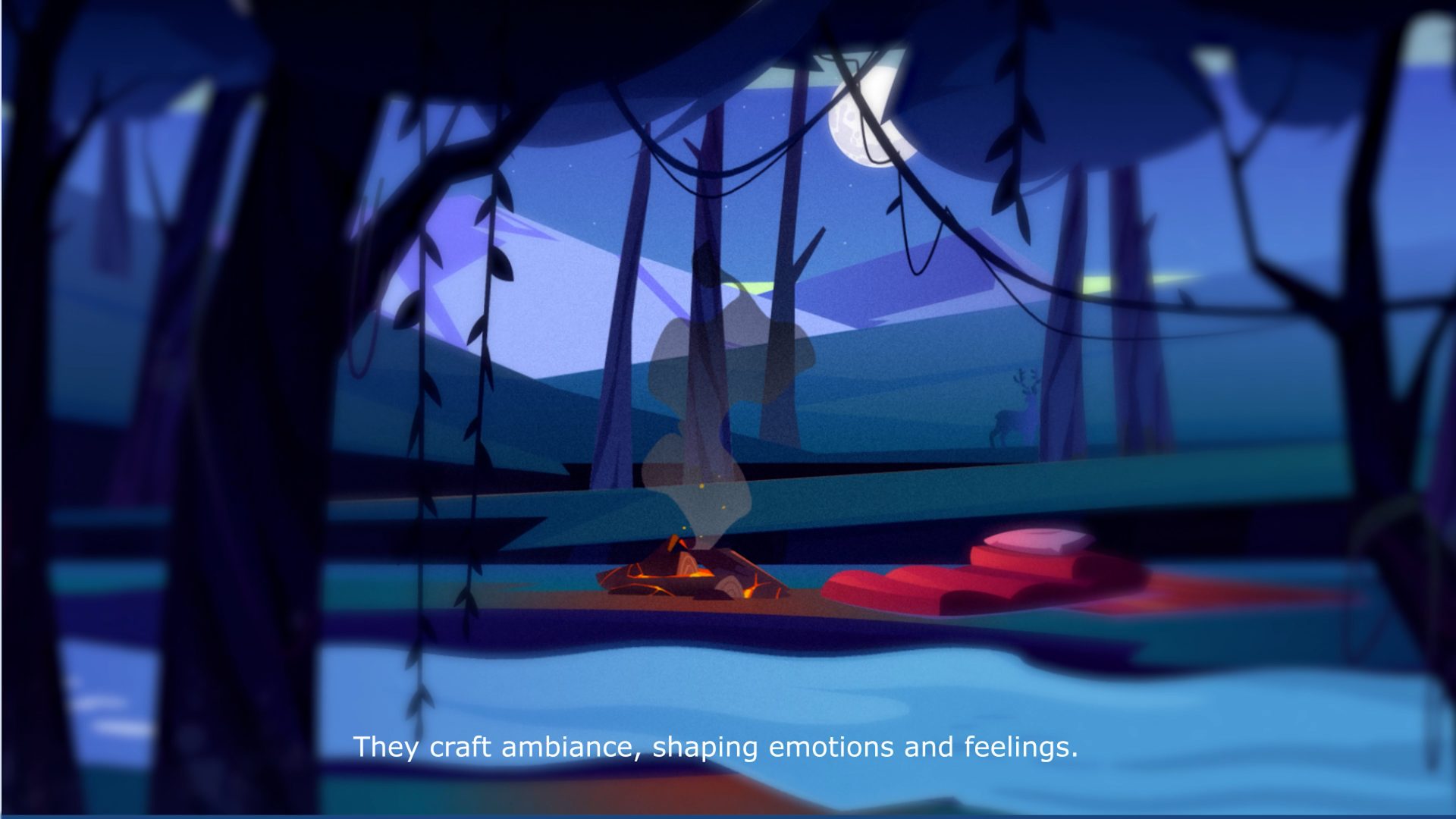 Embark on a minute-long odyssey into the land of sound design through dynamic video. By combining 2D and 3D elements with captivating characters, an aesthetic masterpiece that celebrates the artistry of sound was born. This R&D journey, a buffet of creativity, combines different styles to seamlessly delight the senses. 2D graphics, enriched with dynamic animations, exude glow, noise and subtle blur, creating a deep sense of depth. 3D characters, born in Mixamo and rendered in Blender, come to life with hair and geometry simulations. Immerse yourself in a harmonious fusion of 2D and 3D where music meets vision, drawing from local soundscapes and trusted sources like Artlist and Freesound.